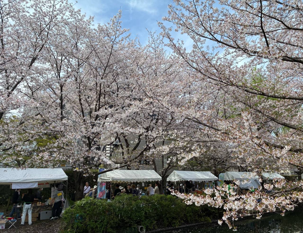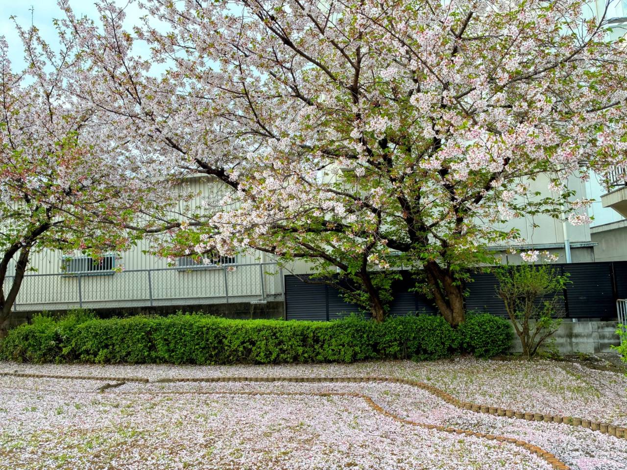 1週間後の今日、雨の後なので花びらはだいぶ散ってしまい、道には花びら絨毯が、川には【花筏】が浮かんでいます。今しか見られない光景ですね。